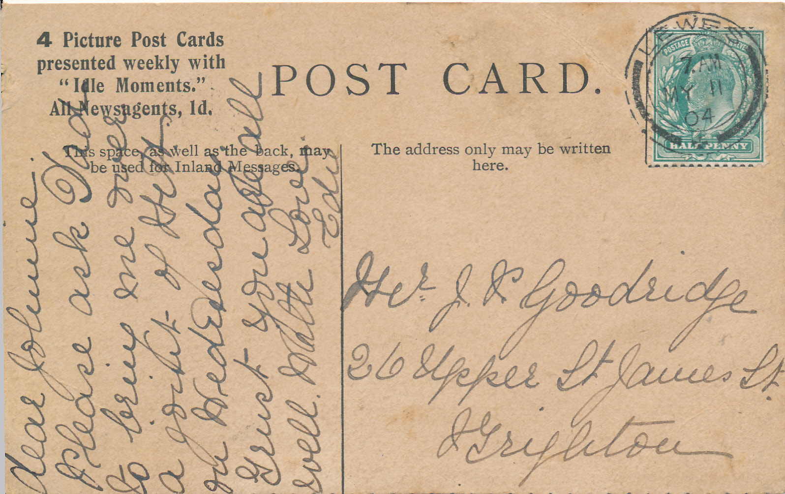 A post card from Mother, Emma Goodridge to John when he was visiting his aunts, Sarah and Fanny in Horsham. Later in his life, he recalled that he generally spent the summer holidays with his maiden aunts or otherwise stayed at home. In August 1903 he was thirteen.
