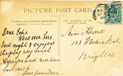 A post card to Miss Hurst, was she the daughter of Mrs F Hurst or another relative? Clearly some connection with the Goodridge/Povey family as there are a number of PCs sent to 103, Western Road in John albums.